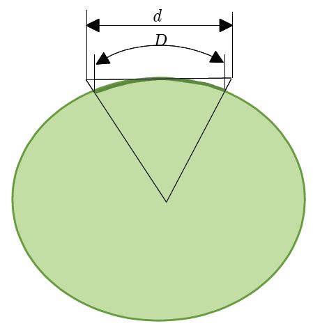이다. d는 지표상 두 지점의 직선 거리이고, D는 곡선 거리이며, r은 지구 평균 반경 6370km이다.