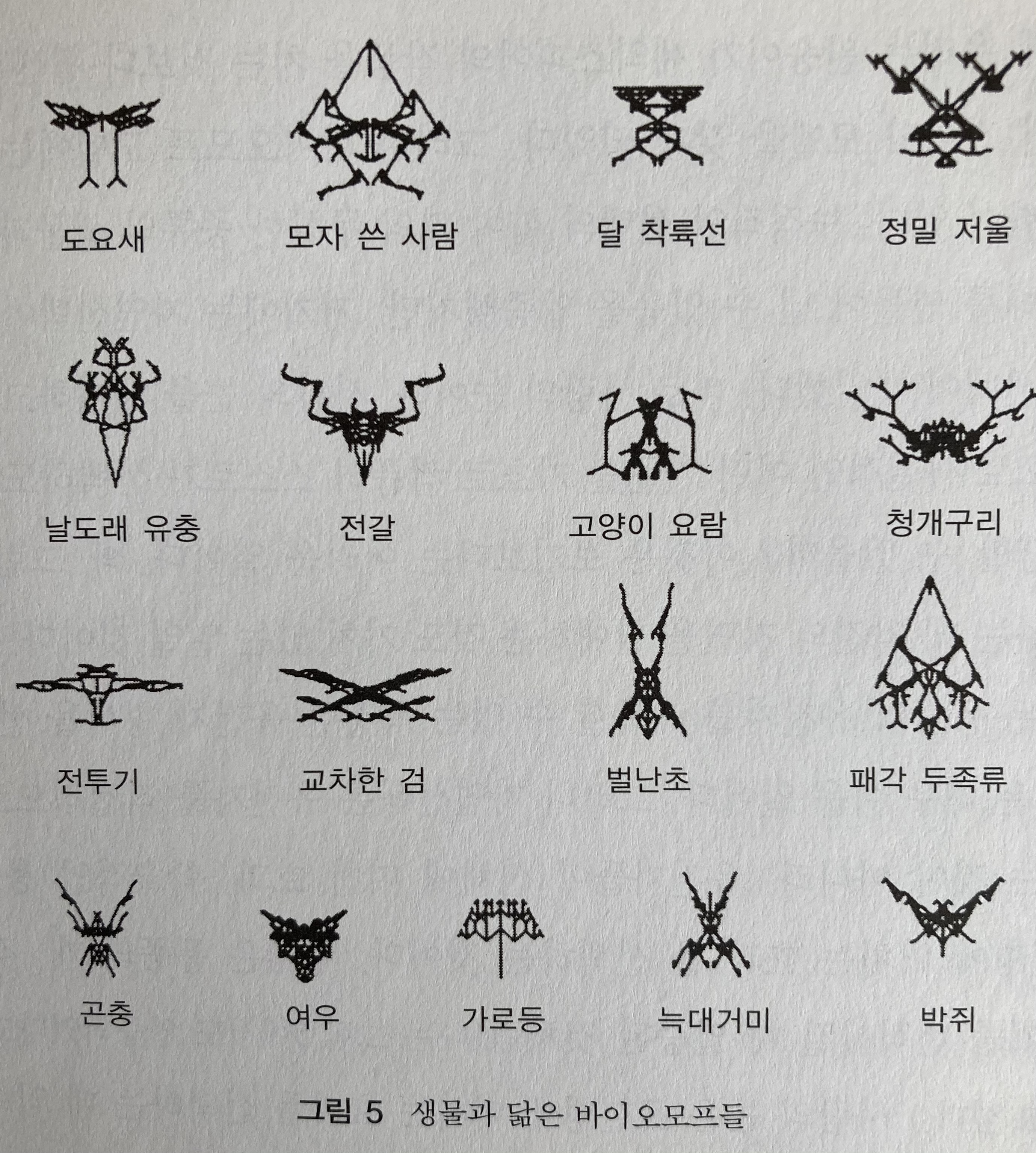 이 장을 정리하기 위해서는 바이오모프의 세계를 이해해야 한다. 고작 9개의 유전자 그것도 음양의 방향으로 한 칸씩만 이 변화하는 9개의 서로 다른 유전자가 세대를 이어 벌이는 돌연변이의 잔치를 이해해야 한다. 길이나 각도의 단순한 변화라는 유전 변이가 29세대를 거치면서 수많은 다양한 바이오모프들을 광대한 유전자 공간에 다양하게 배치한다.