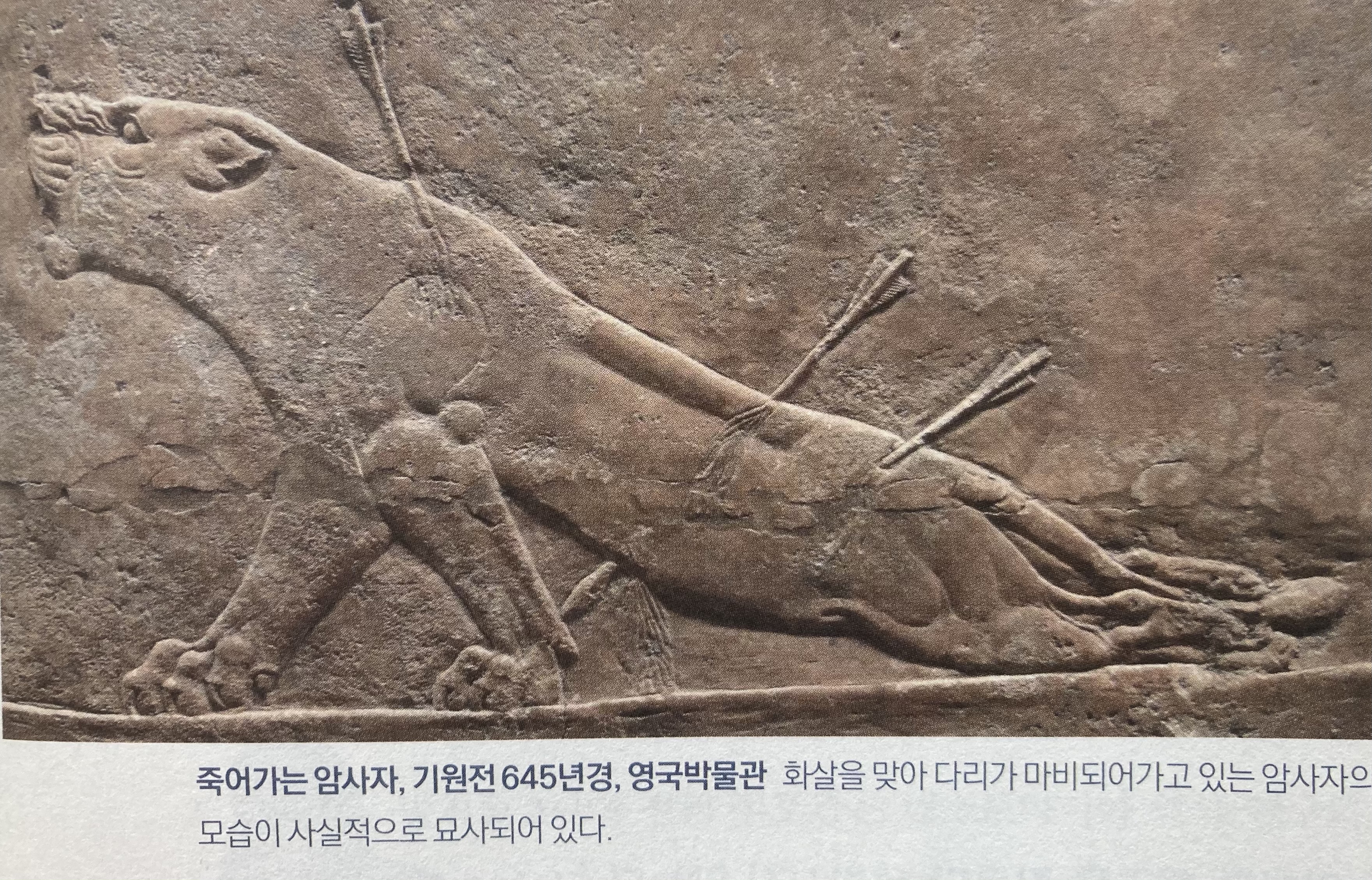 "아슈르바니팔 왕은 살아 있는 사람이 아닌 로봇처럼 딱딱한 모습이지요. 하지만 죽어가는 사자를 표현한 방식은 다릅니다. 표정이나 세세한 근육의 묘사를 보세요. 작가가 상상력을 최대한 발휘해 사자의 동적인 움직임을 생생하게 표현해냈습니다." (478쪽)