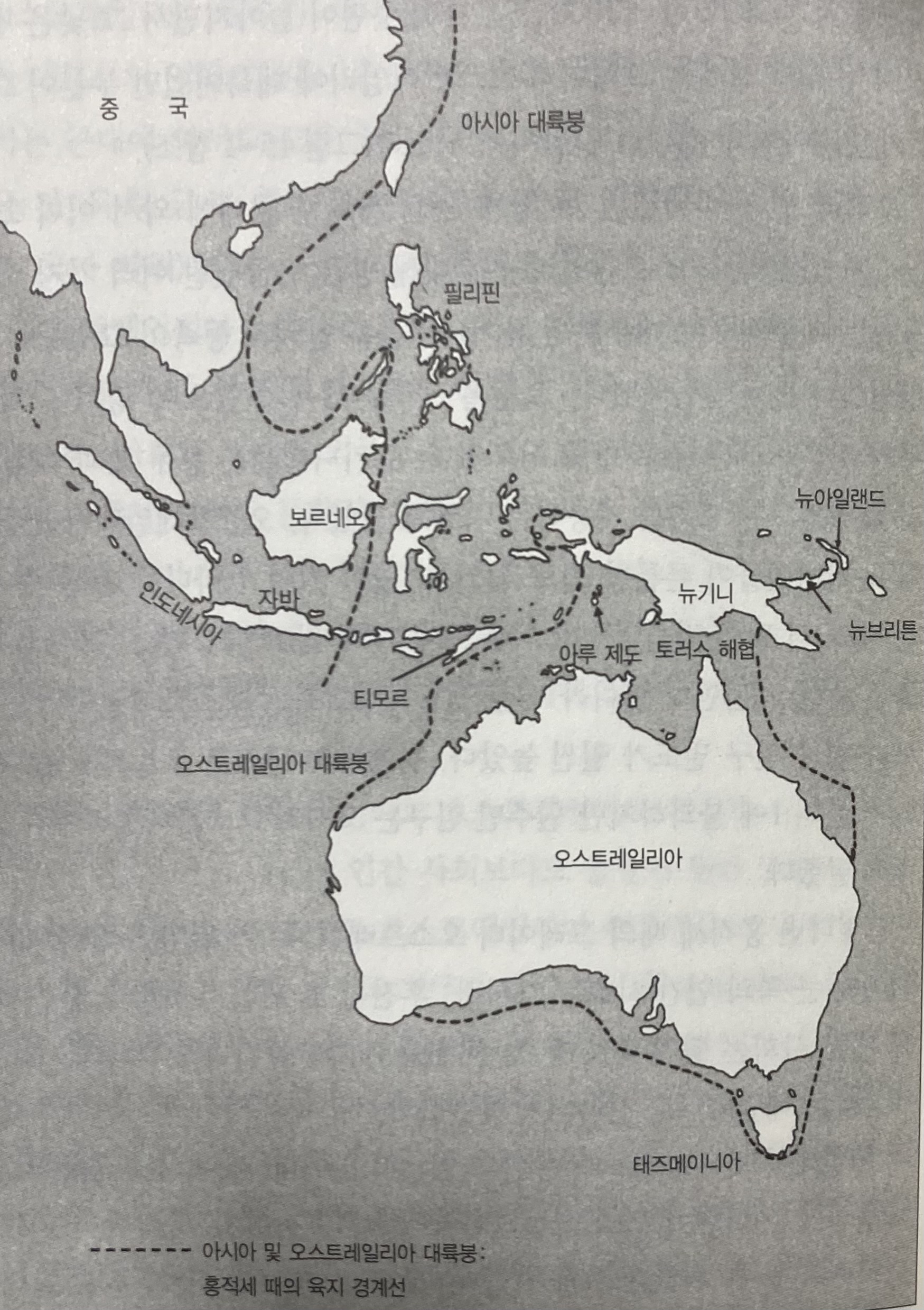 "40000년 전만 하더라도 오스트레일리아 원주민 사회는 유럽을 비롯한 그 어느 대륙의 인간 사회보다도 출발이 훨씬 빨랐다. 석기의 날을 갈아서 사용한 것도 오스트레일리아 원주민들이 세계에서 가장 빠른 편이었고 (중략) 바위 표면에 그린 벽화도 전 세계에서 가장 오래된 편에 속한다. (중략) 해수면이 높아지면서 그 낮은 땅이 물에 잠겨서 전에는 그레이터 오스트레일리아 대륙이었던 부분이 오스트레일리아와 뉴기니로 갈라지게 되었다.
