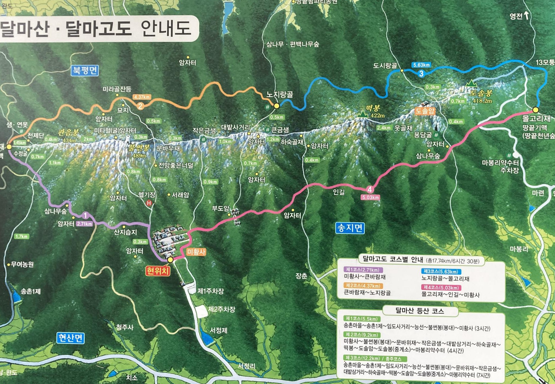 달마봉에서 아들들은 영상통화로 장관을 함께 했다. 내려오는 길도 서로의 안전을 확인할 수 있었다. 미라골 잔등에 도착해서 안내표지판을 보니 미황사까지는 4.5km가 남았다. 그리미와 우주신도 2코스에 접어들었다고 하니 20분 정도면 서로 만날 수 있으리라. 물과 간식도 없이 산길을 걷고 있을 두 사람을 생각하니 쉴 시간이 없다. 계속해서 걸었다.