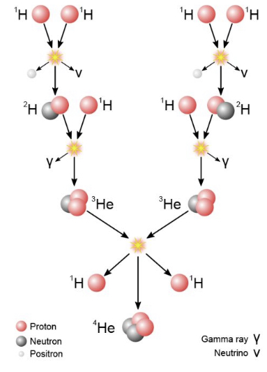 양성자 proton 2개가 최초에 충돌하면서, Hn과 중성미자(v)와 양전자(positron)이 나오고,