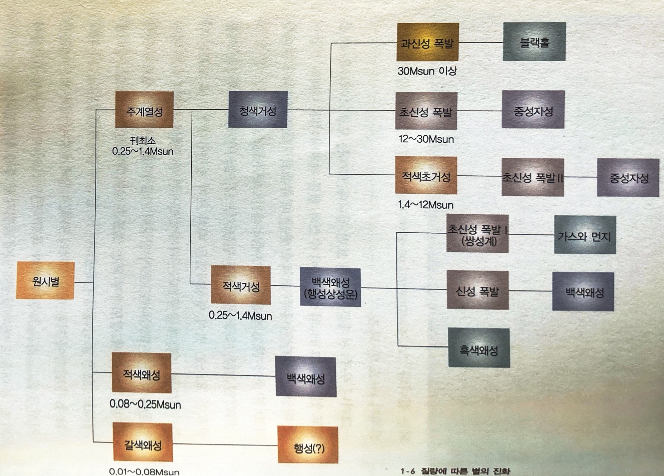 태양의 질량보다 1.4배 이하 1/4이상인 별들은 적색거성 -> 백색왜성을 거쳐 가스와 먼지, 백색왜성, 흑색왜성이 된다.