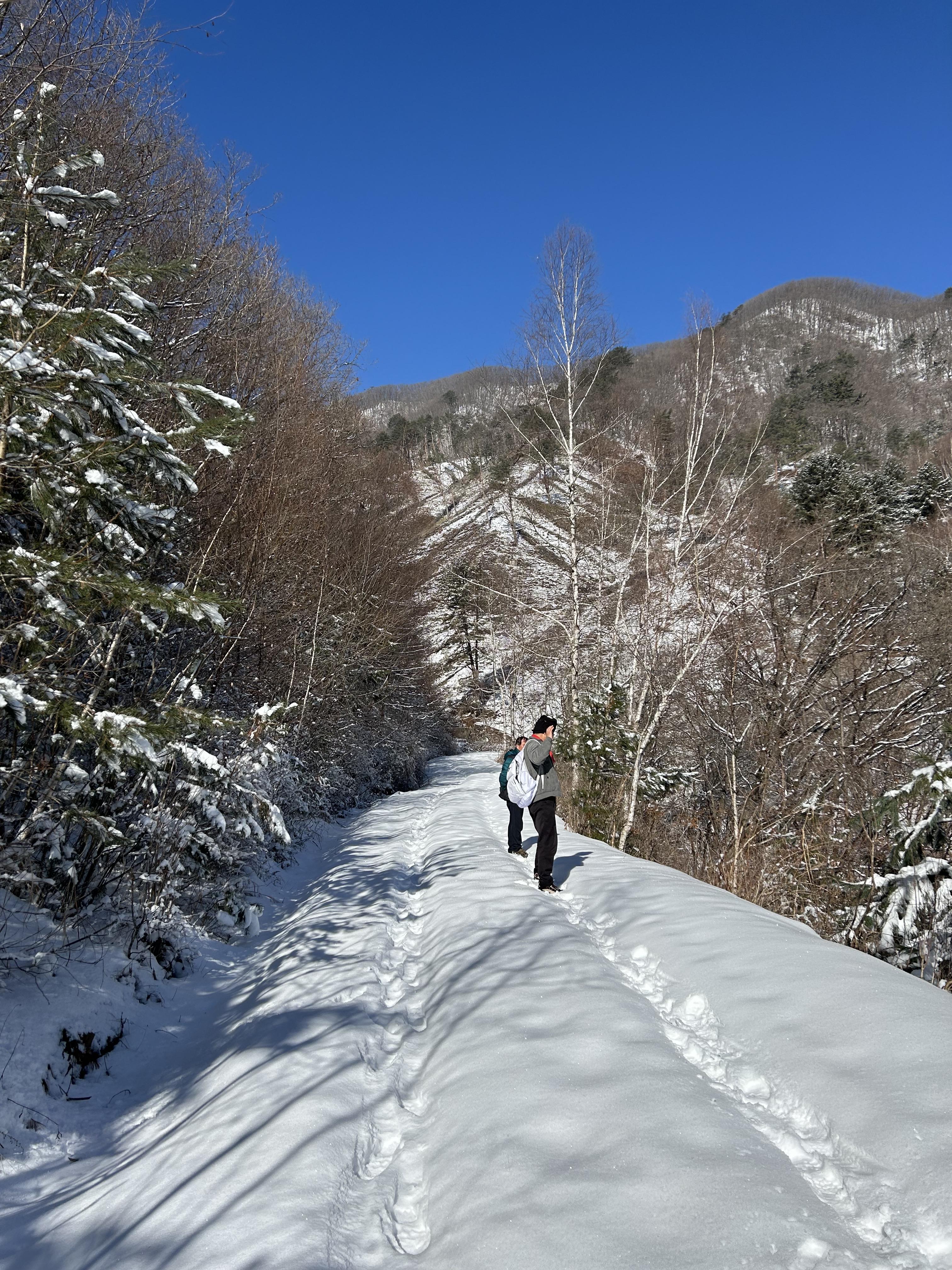 새벽 4시까지 시달리다가 간신히 잠이들려했는데, 높은 베개때문에 깊은 잠을 자지 못했다. 8시부터 잠을 깨우는데, 눈이 떠지지 않는다. 간신히 몸을 일으켜 세수를 하고 태기산을 향해 눈길을 걷는다.