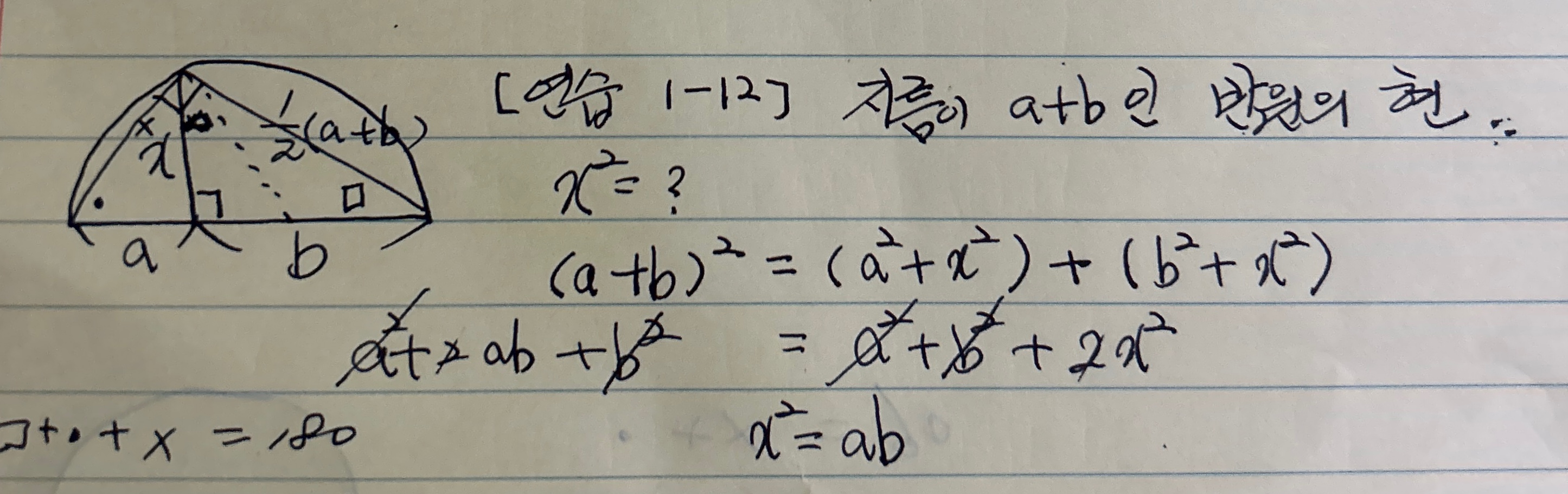 아래 문제에서 반원의 현의 길이의 제곱은, a x b다.