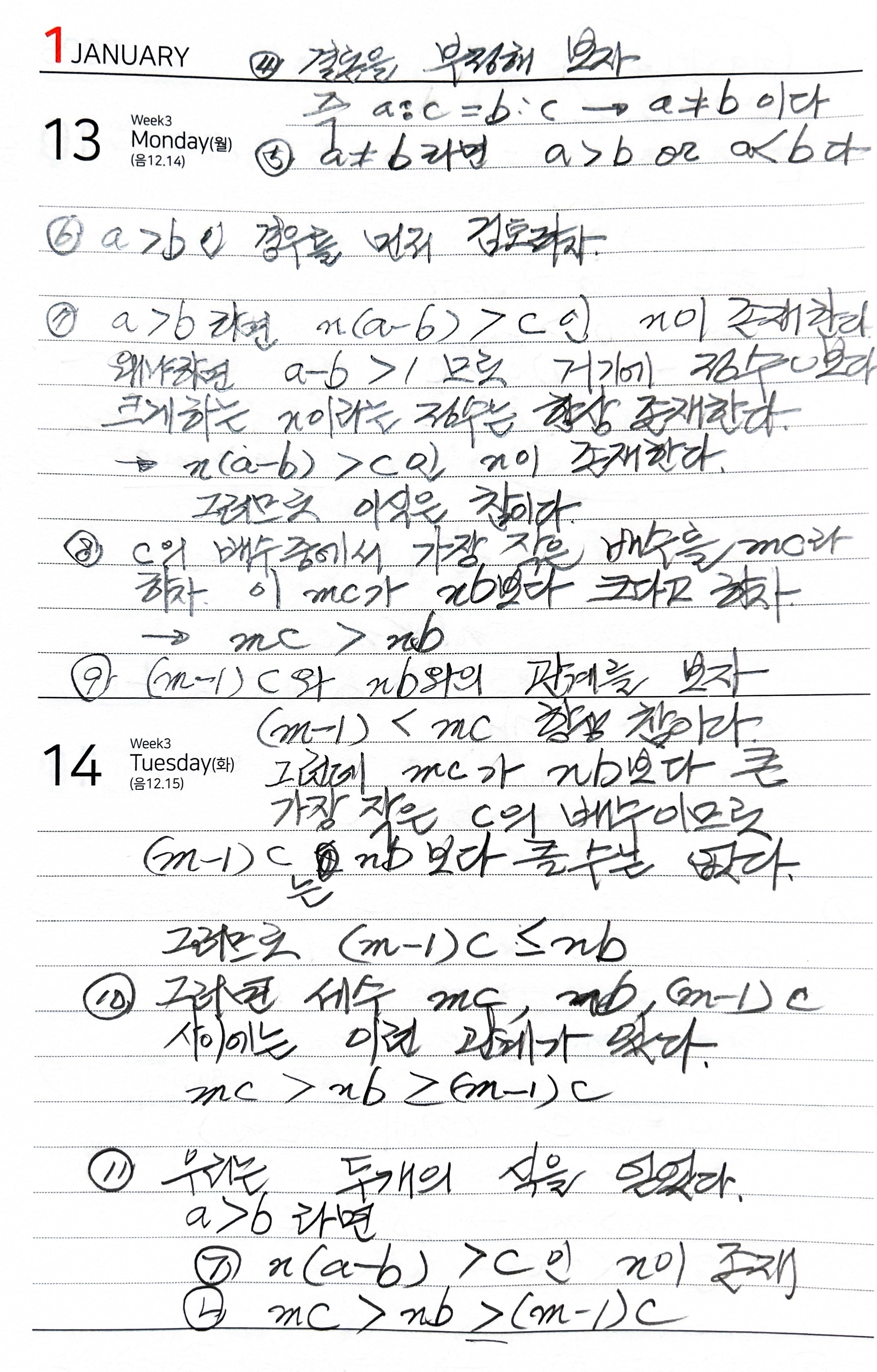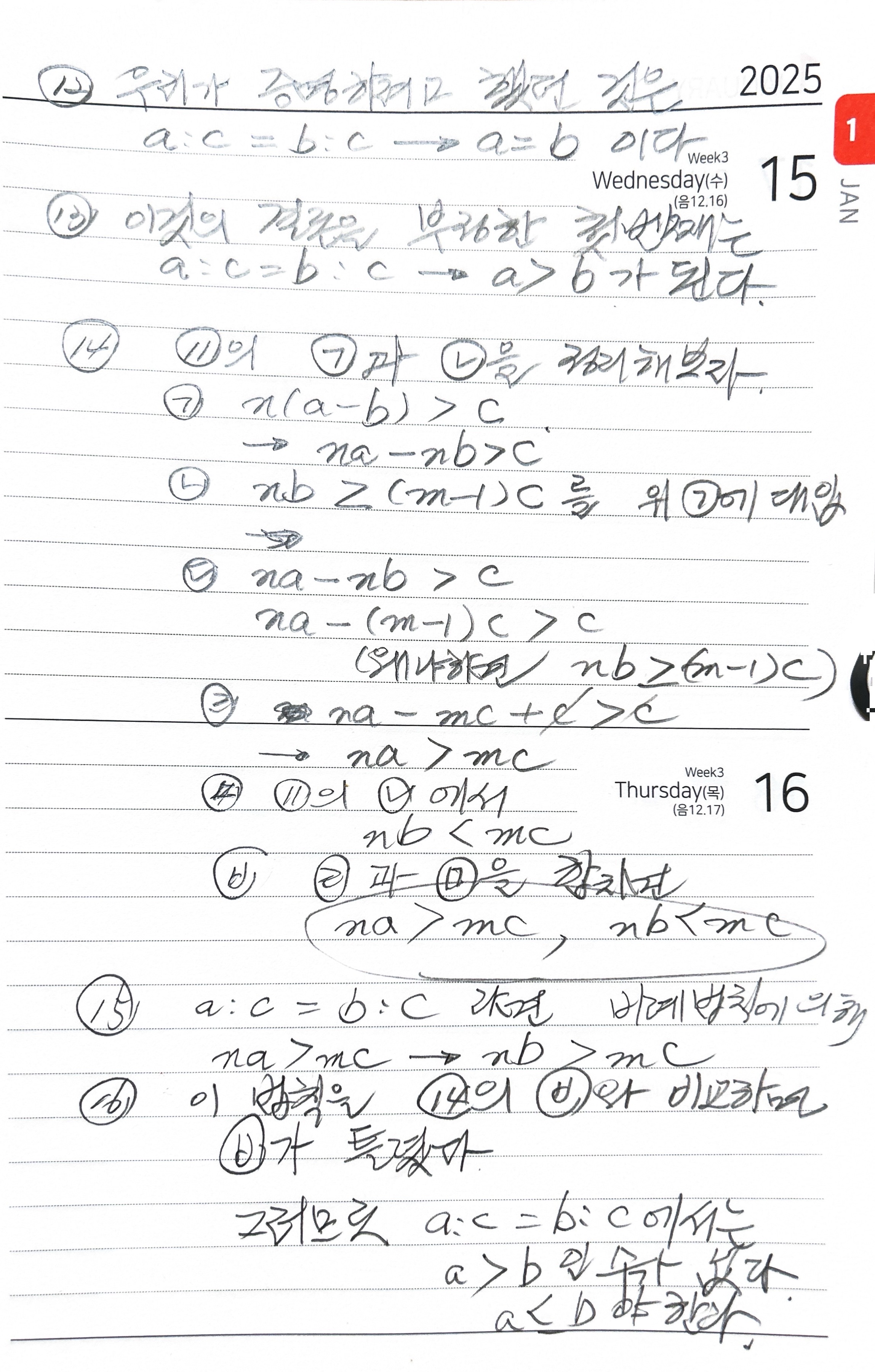 3) 그림의 맨마지막 (16)의 증명에 뒤이어서 a<b인 경우도 똑같은 과정을 거쳐 증명을 하고나면 비로소