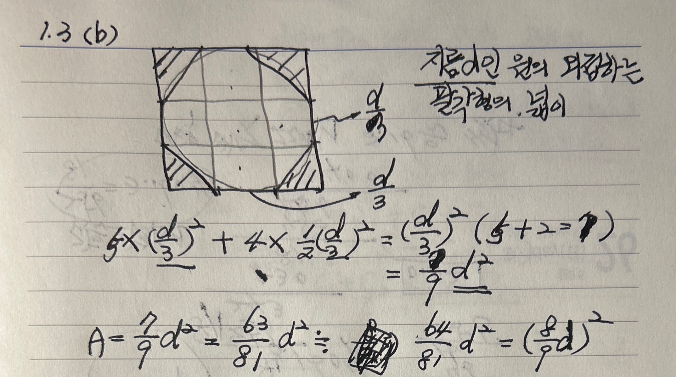연습문제 1.3 (b) 는 지름이 d인 원에 외접하는 정사각형이 있다. 이 사각형의 변을 3등분해서 만드는 팔각형의 넓이를 구하는 문제다. 8각형이지 정8각형이 아닌 것에 주의해야 한다.