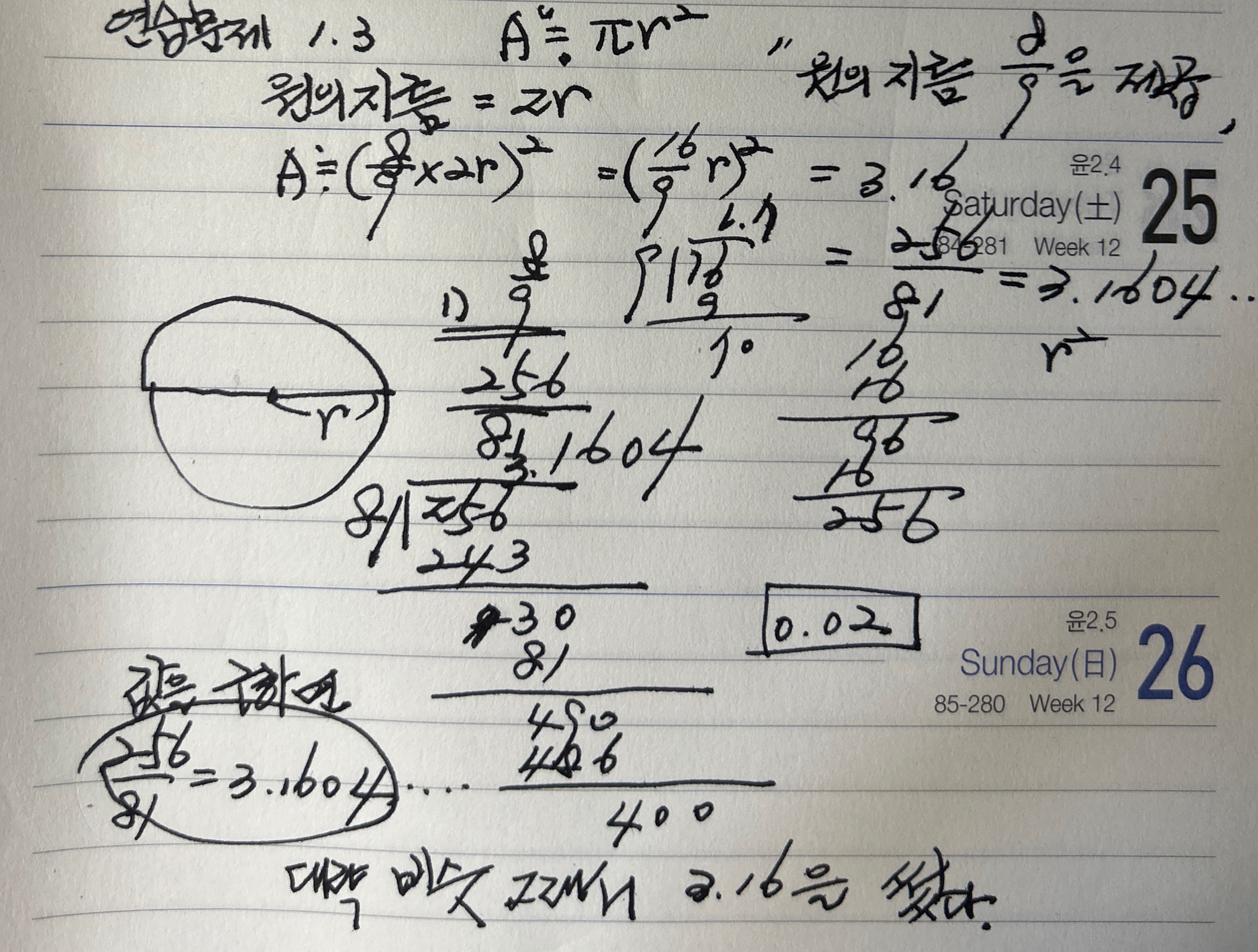 연습문제 1.3 (a) 린다 파피루스에서 원의 면적을 구할때, 지름의 8/9을 제곱해서 구했다고 한다. 이것을 계산해서 현재의 파이값과 비교했더니 약간의 차이는 난다. 이집트에서는 파이를 대략 3.16으로 계산했다고 한다.