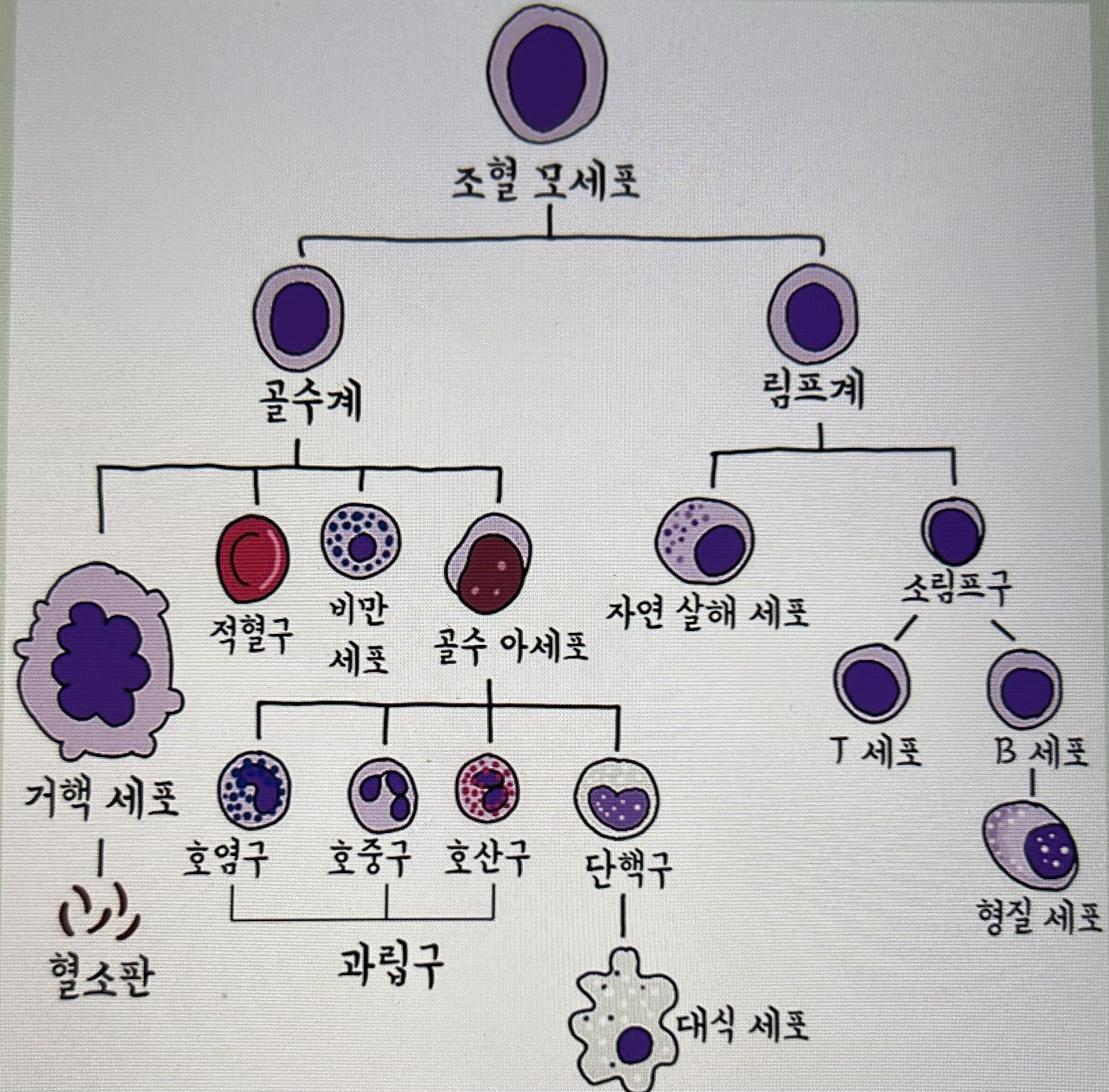 일단 피를 만드는, 골수속의 조혈모세포가 무엇을 = 피라고 부르면 있어야 하는것들을 만들어내지 아는것이 좋겠다. 피는 크게 골수계와 림프계로 나뉜다. 골수계는 만들어지는 곳이 뼈라는 것을 말하고, 림프계는 골수에서 만들어져 주로 활동하는 곳이 림프절이다.