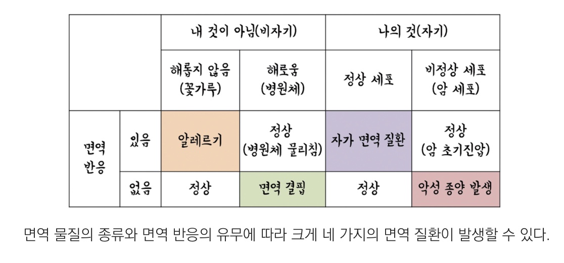 (중략) 상황에 따라 면역 반응은 강할수록 좋은 경우가 있고(감염성 질환, 암의 예방), 반대로 약할 수록 좋은 경우도 있다(알레르기, 자가 면역 질환, 장기 이식). 면역 반응은 외부의 병원체와 나의 면역력이 요란하게 맞부딪히는 단순한 힘 싸움이 아니다. 우리가 면역에 대해 조금 더 다가간다면 면역력을 강하게 만들려는 한쪽의 시도가 오히려 얼마나 무의미하고 위험한 것인지 이해할 수 있게 될 것이다." (5~6%)