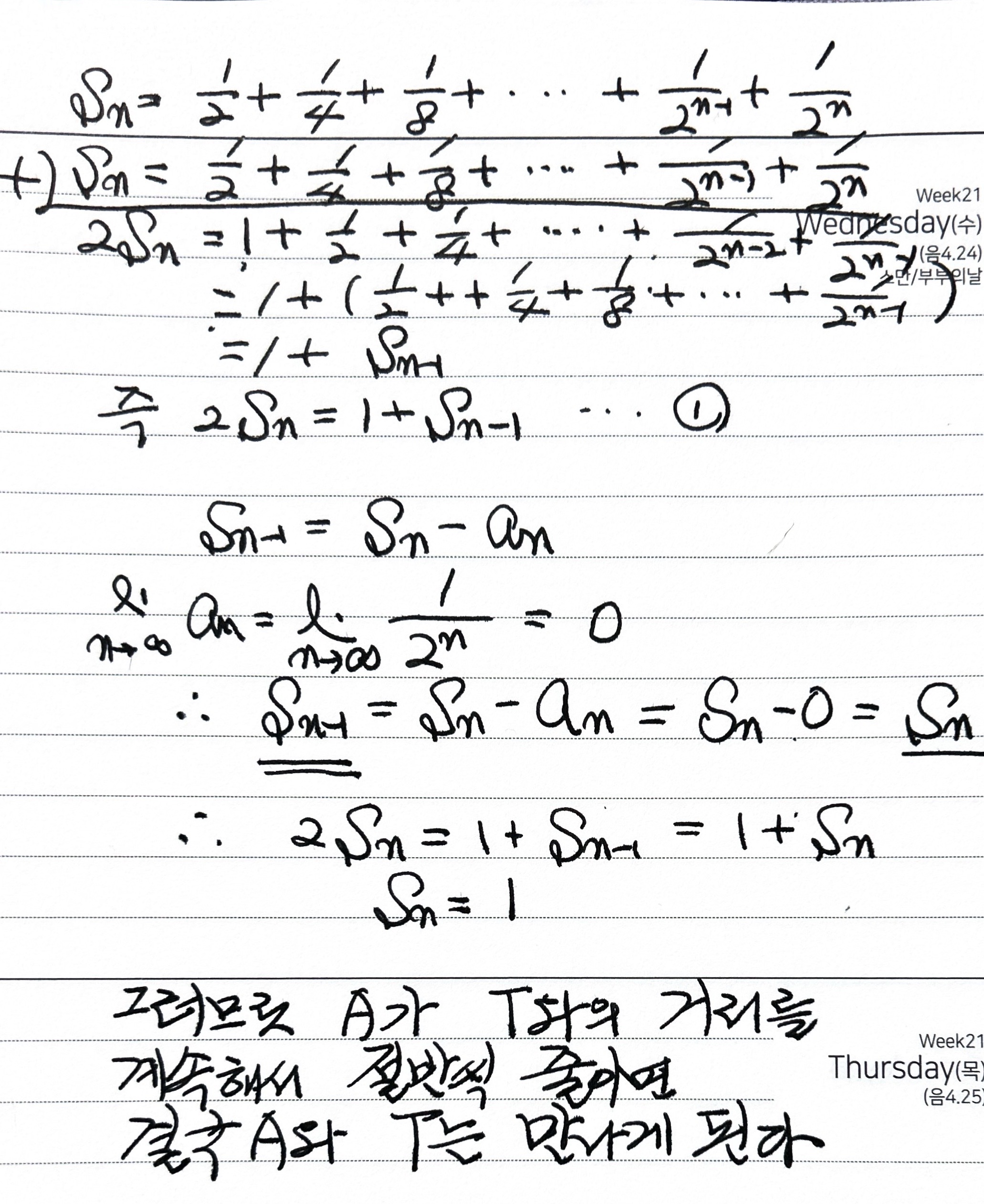 2) 목표지점 L에 닿기 위해 끊임없이 1/2씩 가면 과연 L에 도착할수 있을까? 도착할수 있다. 무한급수로 풀면 된다.