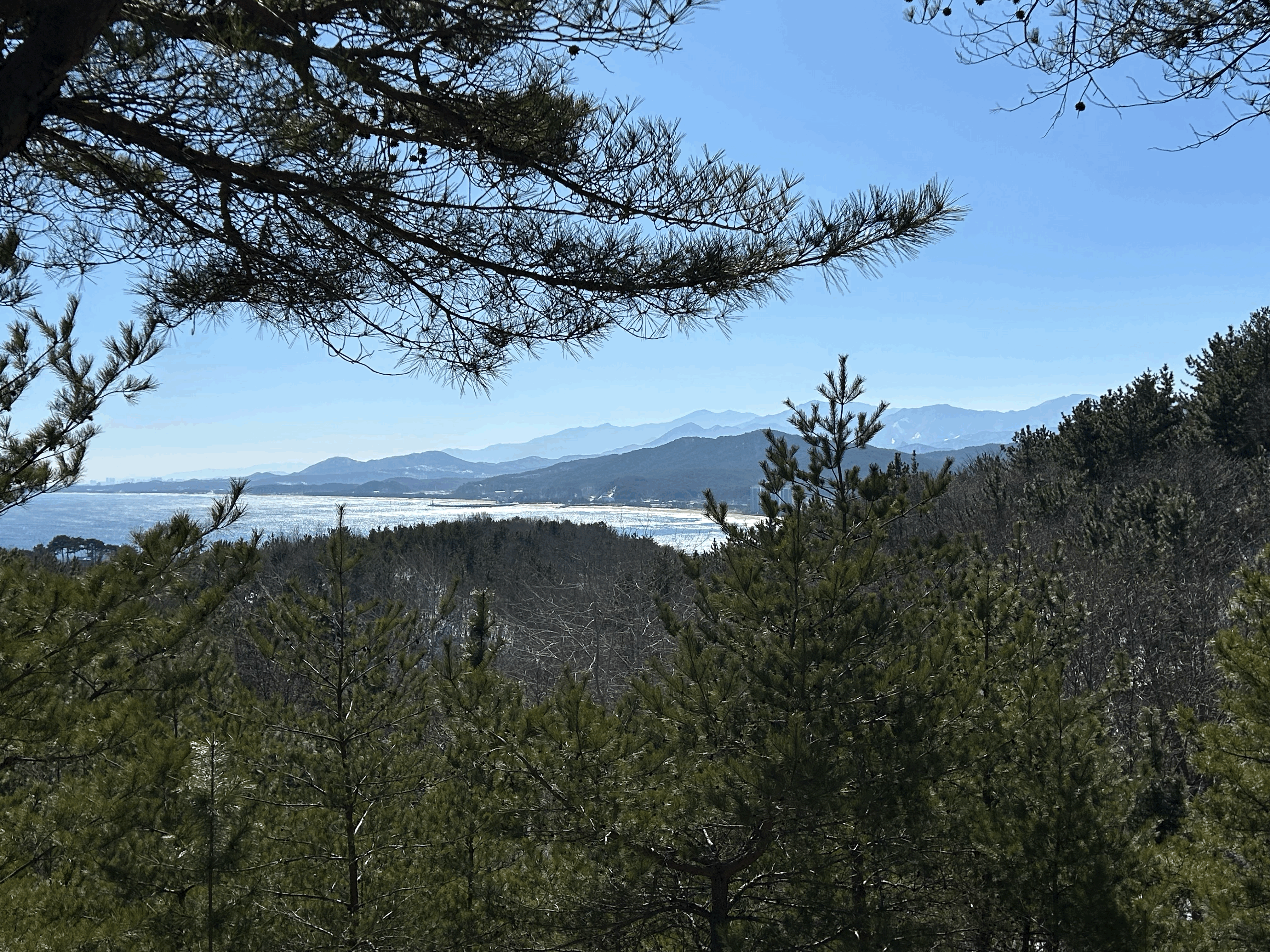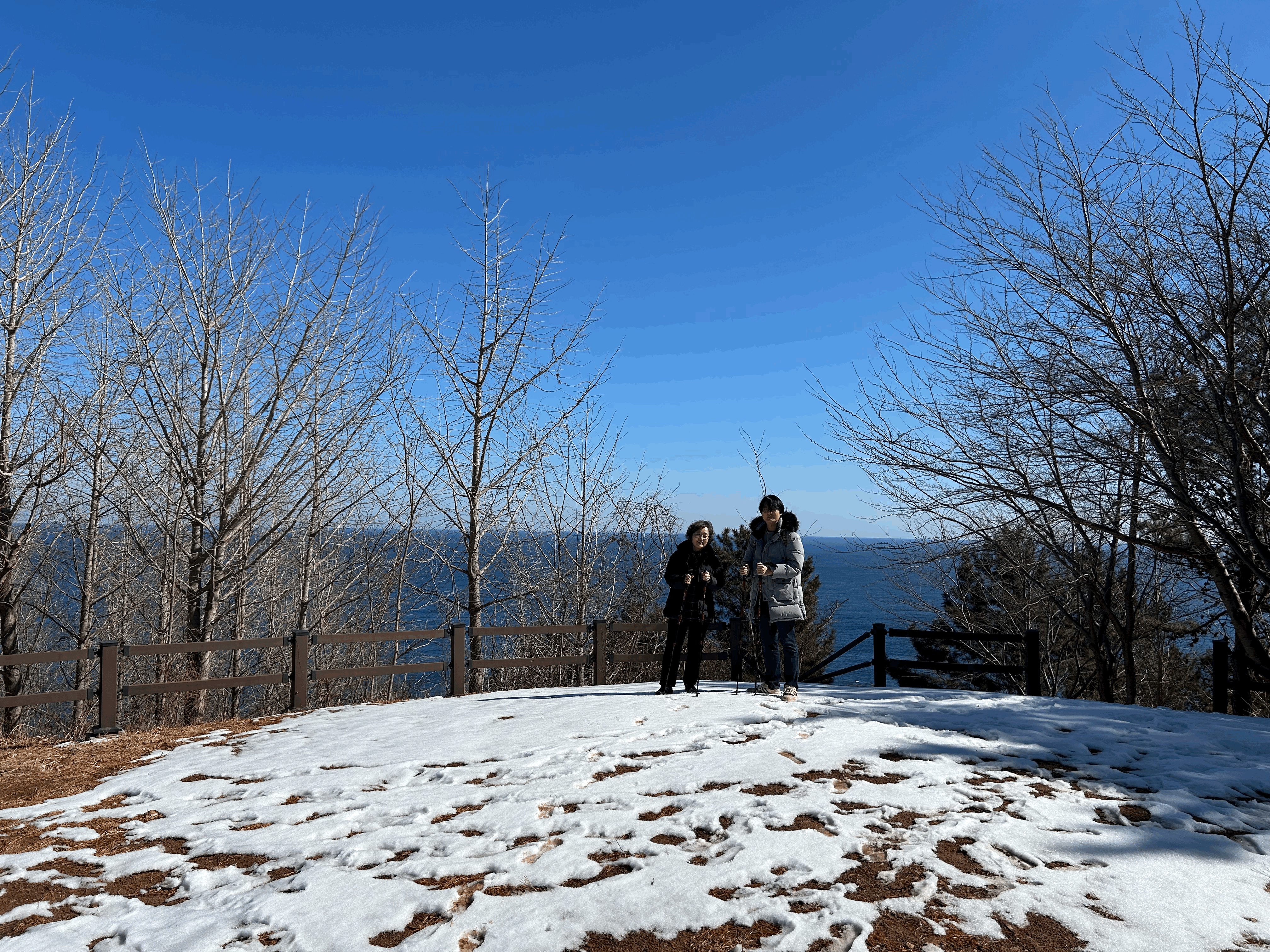 아이젠을 놓고 온것은 실수였다. 다행히 미끄러짐 사고는 없었지만 해맞이 공원에 오르자마자 화진포쪽으로 온통 눈길이다. 그리 미끄럽지는 않았지만 위협이 되었다.