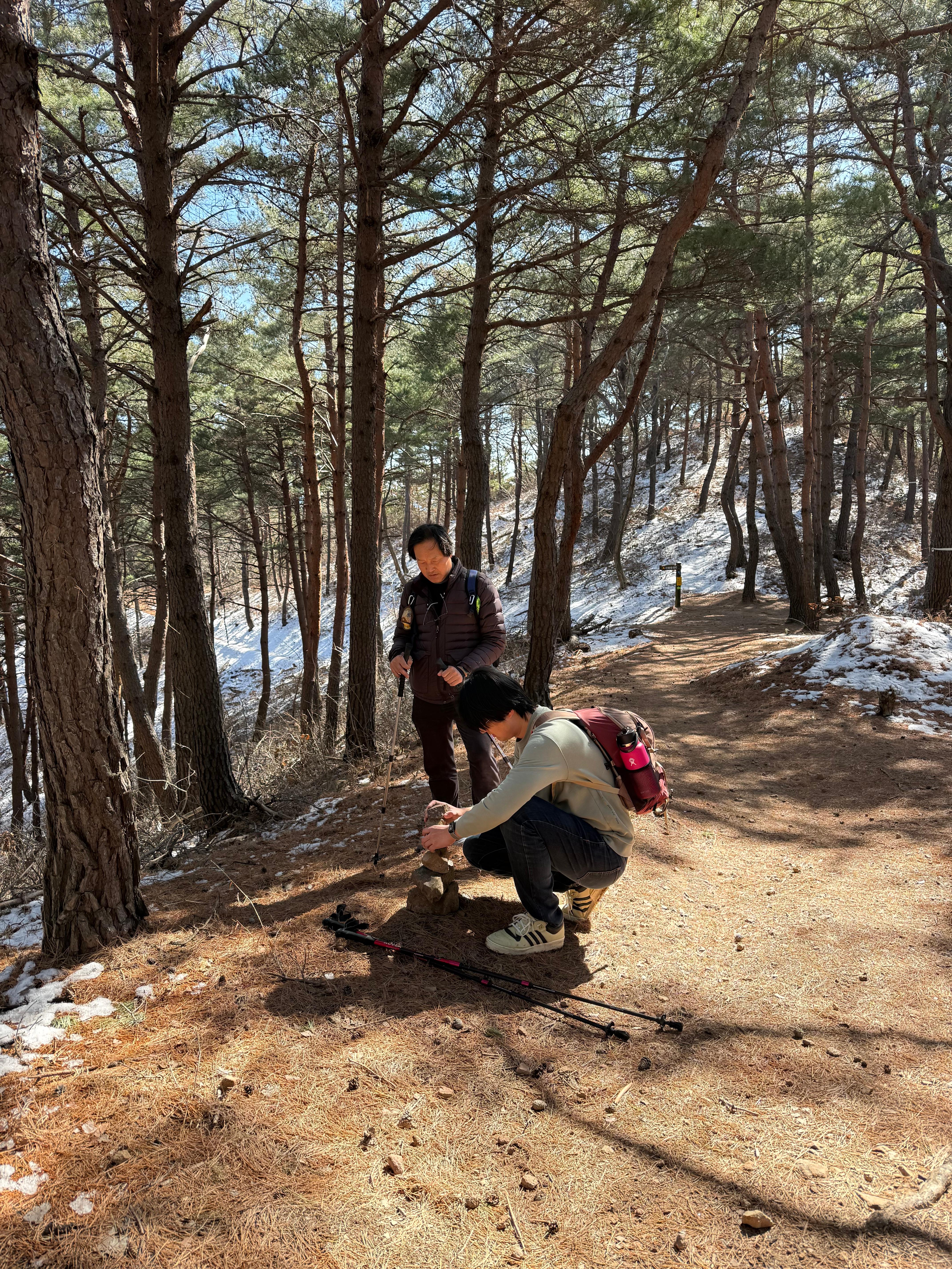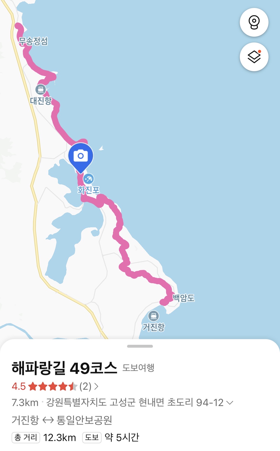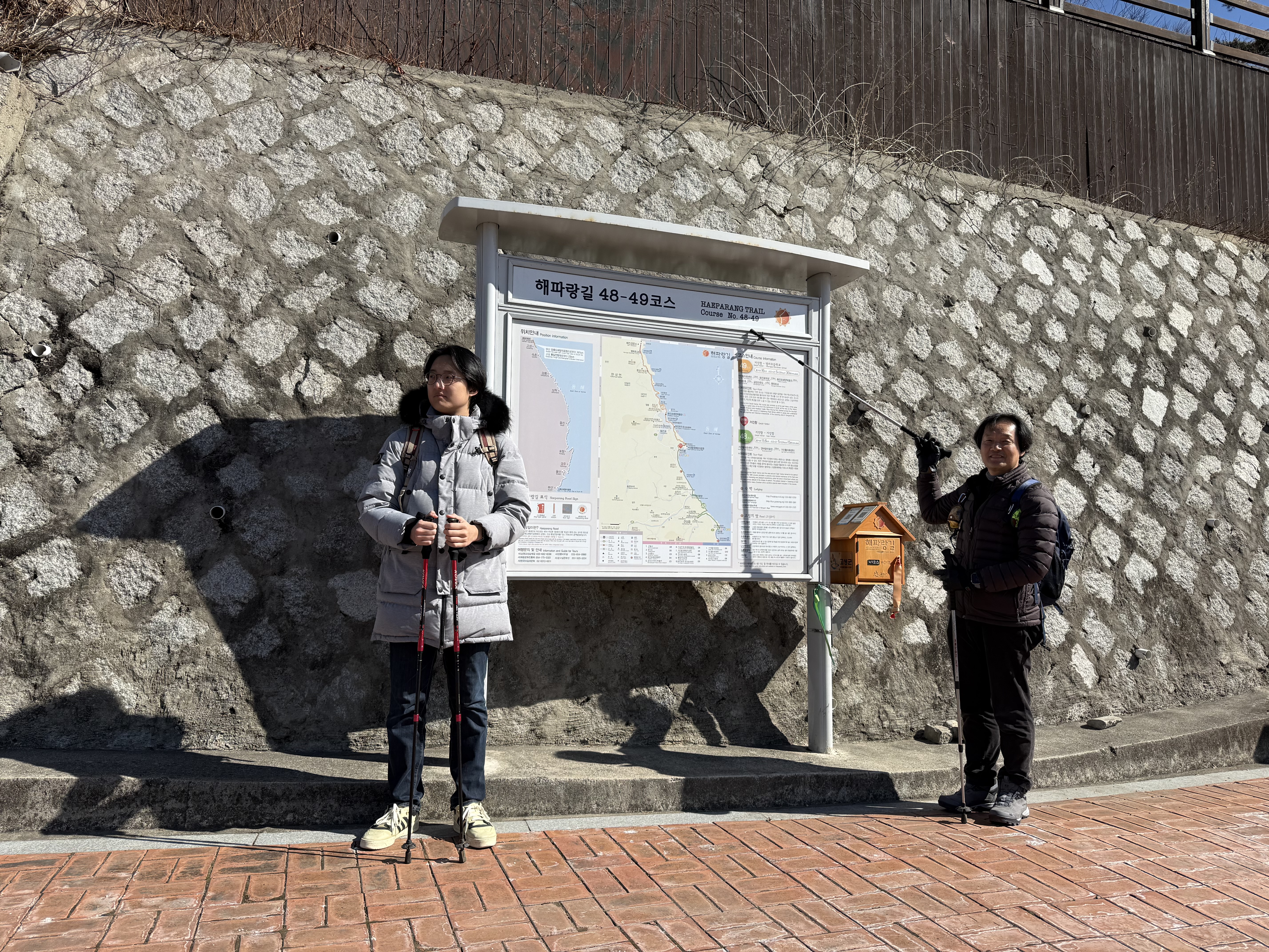 부지런한 젊은이들은 송림과 바다사이를 개운하게 달려갔다 오는데, 우리는 부지런히 빵과 샐러드와 컵라면으로 아침을 먹고 해파랑길 49코스 시작점인 거진수협 앞으로 갔다. 주차장에 차를 대고 아이젠은 차에 두고 스틱만 들고 길을 나섰다.