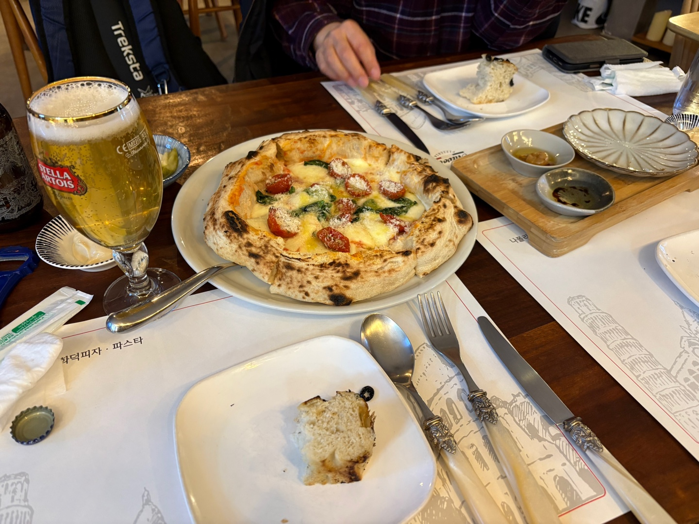 숙소를 어디에 잡을까하다가 속초에서 저녁을 먹고 근처의 숙소 3인실(45,000원)에 들어갔다. 잠잘 공간과 화장실 공간이 모든 시설이지만 세탁기에서부터 인덕션까지 모두 갖춰져 있다. 녹차는 있고, 커피는 없다. 어제 저녁은 족발과 설렁탕, 메밀국수, 소주 2병 (71,000원)을 마셨다. 충분했다. 참나무장작 화덕구이 피자가 있다는 것을 괜히 알아내서 거기까지 찬바람을 맞으며 걸었다. 자부심 가득한 사장님의 친절한 안내로 맥주 한병과 피자한판(32,000원)을 먹었더니 너무 배가 부르다. 숙소까지 거의 1km를 걸어왔는데도 배가 꺼지지 않아 식곤증으로 샤워를 마치자마자 잠이 들었다.
